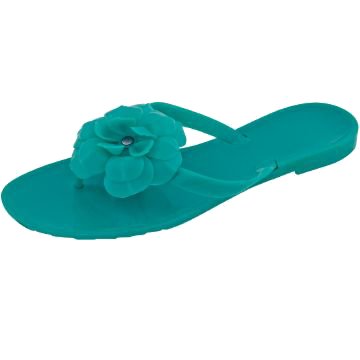 Attraktive Zehentrenner Sommersandale mit großer Gummi-Blumenapplikation als Eyecatcher. Ob zum Bikini am Strand oder lässig zum Rock oder zur Shorts - die Zehensandale ist ein anhaltender Trend und darf in keiner guten Sommergarderobe fehlen. Durch das robuste Gummimaterial eignen sich die Sandalen auch perfekt für einen Spaziergang am Meeresufer, denn Wasser kann dieser Zehensandale nichts anhaben.