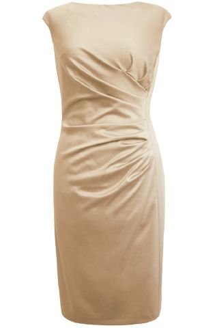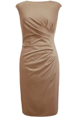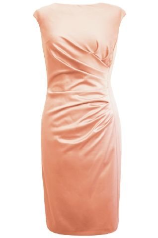 Edles, kurzes Etuikleid aus Satin. Der Ausschnitt ist halsnah, die Ärmel sind leicht angeschnitten. Seitliche, asymmetrische Faltendetails verleihen dem Kleid einen modernen, coolen Touch und betonen die schmale Taille. Das Kleid ist feminin auf Figur geschnitten. Dieses Kleid lässt sich wunderbar auch als Standesamtkleid tragen.