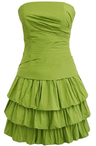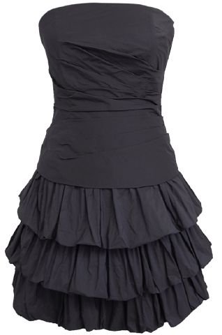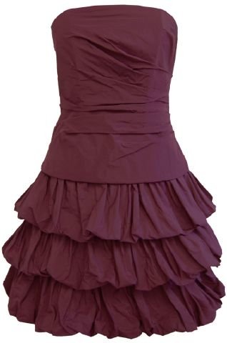 Kurzes Taftkleid. Die eng anliegende Corsage endet in Hüfthöhe. Ein dreilagiger durch feine Kräusel leicht schwingender Stufenrock unterstreicht den jungen Look des Kleides.
